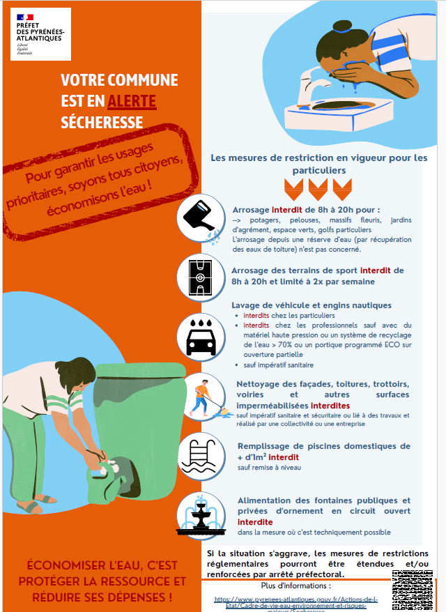 Vous trouverez ci-joint l’arrêté préfectoral réglementant temporairement les usages de l’eau potable ainsi que la plaquette d’information.